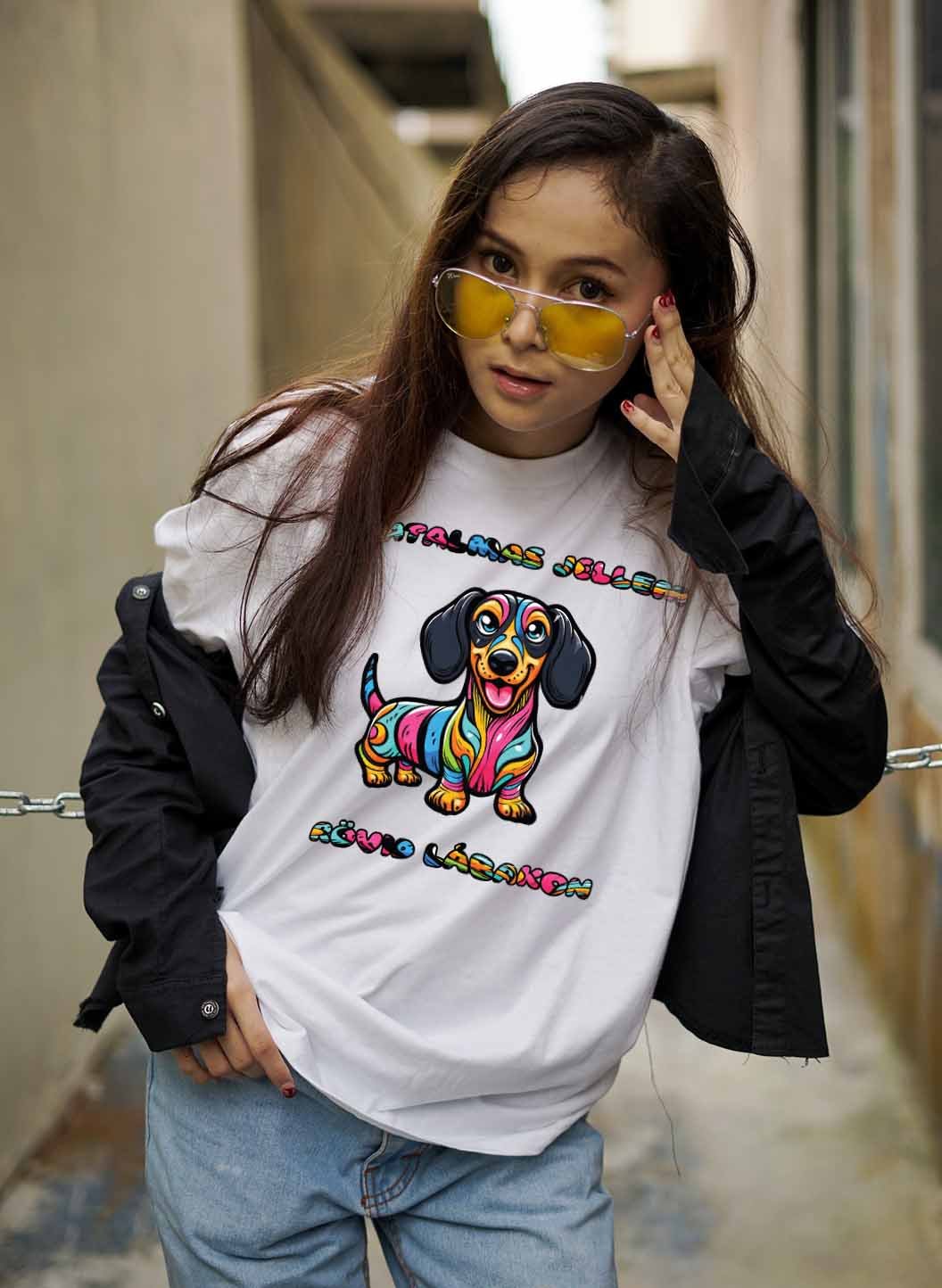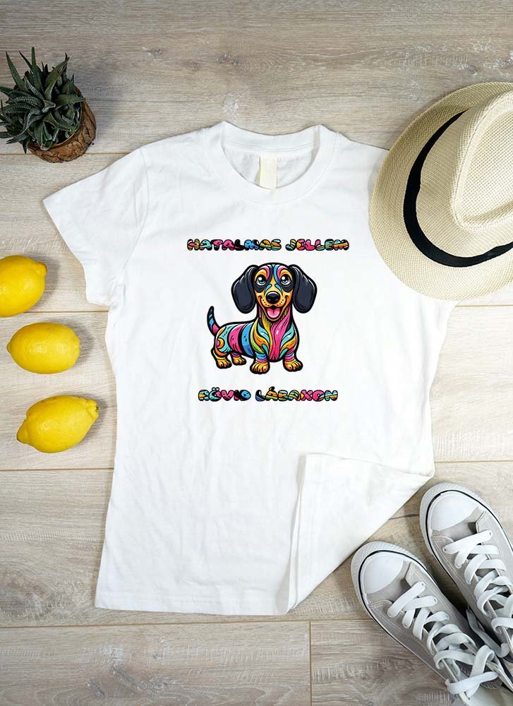 Tedd egyedivé stílusodat ezzel a színes tacskós pólóval, melyen a „Hatalmas Jellem Rövid Lábakon” felirat mosolyt csal minden rajongó arcára. Ez a szórakoztató és lenyűgöző minta ideális választás minden tacskó szerelmese számára, akik szeretnének kifejezni egy kis egyediséget és vidámságot az öltözködésükön keresztül. Legyen ez a póló a te stílusod kifejezője és hű társa minden nap!