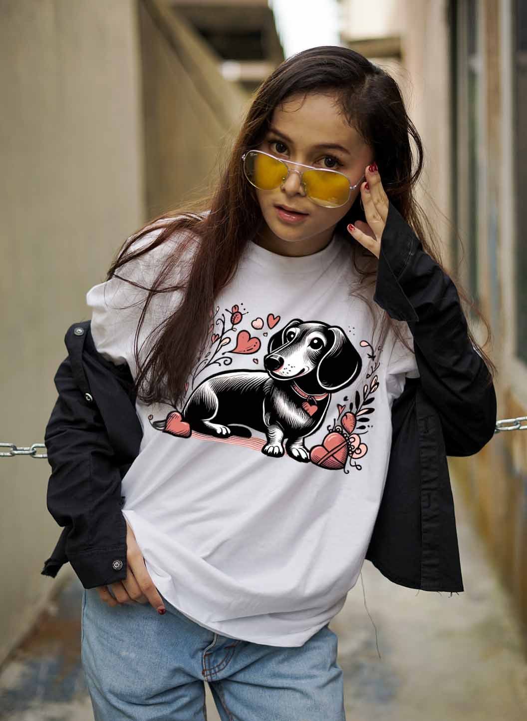 Válaszd ezt a szív- és virágdíszes tacskó pólót! A cuki tacskó a virágok és szívek között garantáltan mosolyt csal majd az arcokra. Legyen ez a póló az ideális választás, hogy stílusosan sétálj a tacskóddal, és kifejezd szeretetedet a fajta iránt!